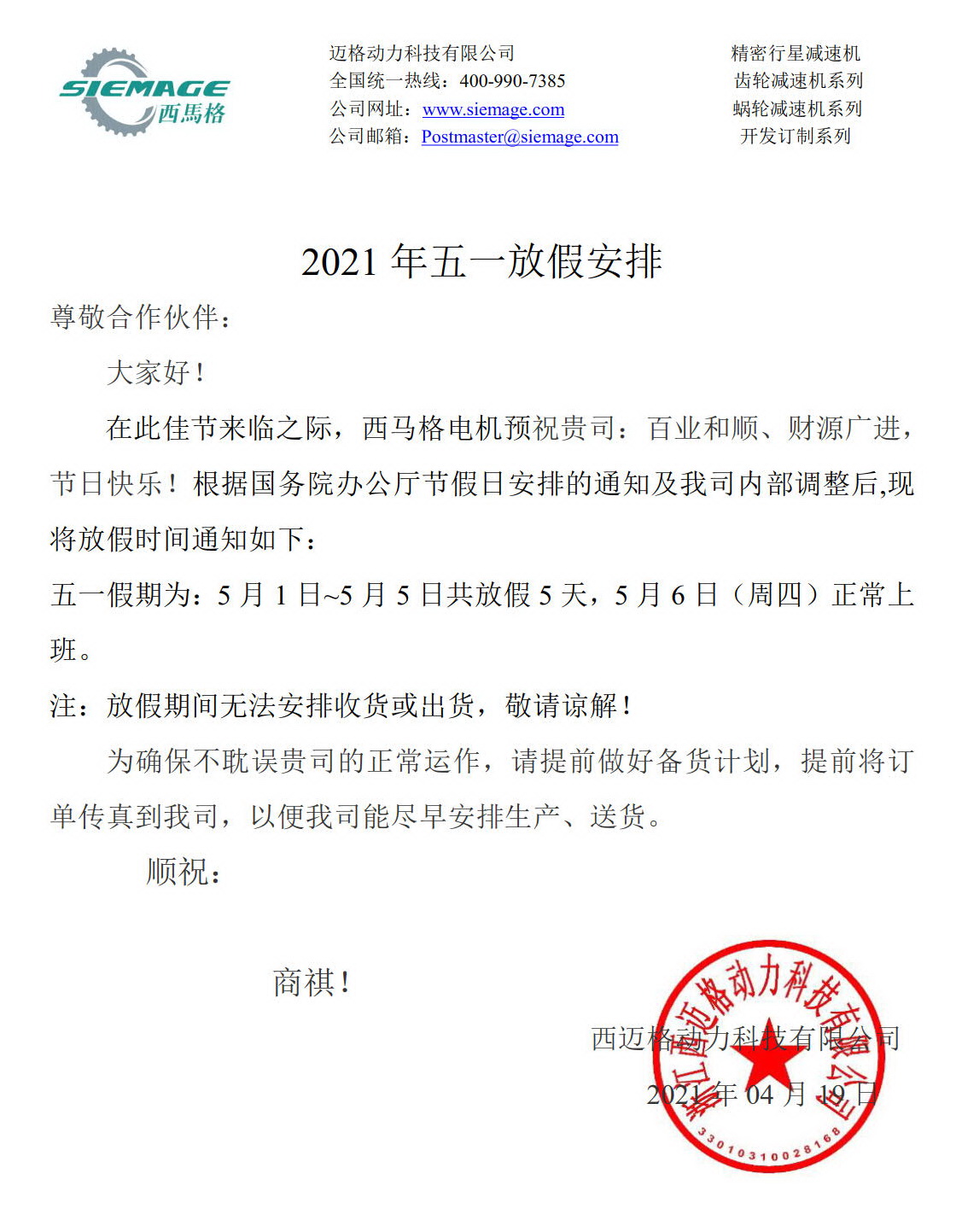 西馬格電機五一放假通